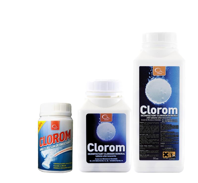 | Se pune o tableta de Clorom in cinci litri de apa, solutia de lucru obtinuta prezinta activitate bactericida conform SREN 1040 si SREN 1276, activitate fungicida conform SREN 1275 si SREN 1650, avtivitate micobactericita si tuberculicida conform SREN 14348 in conditii de curatenie si murdarie. O tableta la 3 litri de apa prezinta activitate virucida conform SREN 14476- polio si adenovirus si o activitate sporicida conform SREN 13704 , bacilul subtilis si bacilul cereus. |